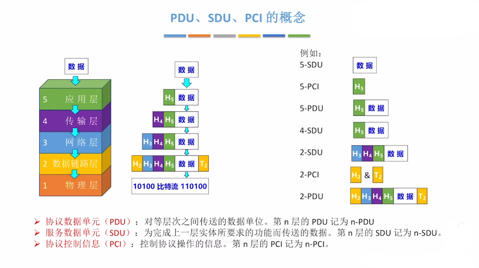 如果一层有多个协议,那么每个协议都独立拥有自己的一套 SDU、PCI、PDU。很明显,PDU = PCI + SDU。